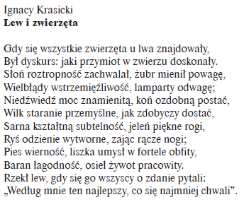 IGNACY KRASICKI ("Kruk i lis", "Przyjaciele", "Potok i rzeka", "Syn i ojciec"),